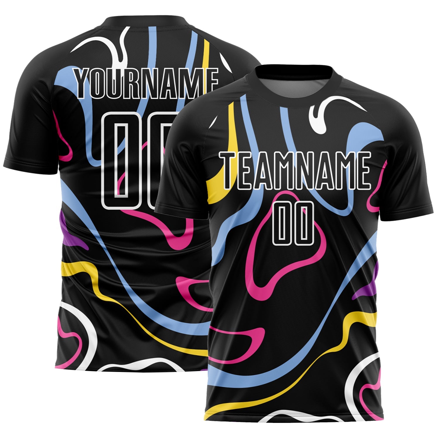 Camiseta de fútbol personalizada con sublimación de formas fluidas en blanco y negro