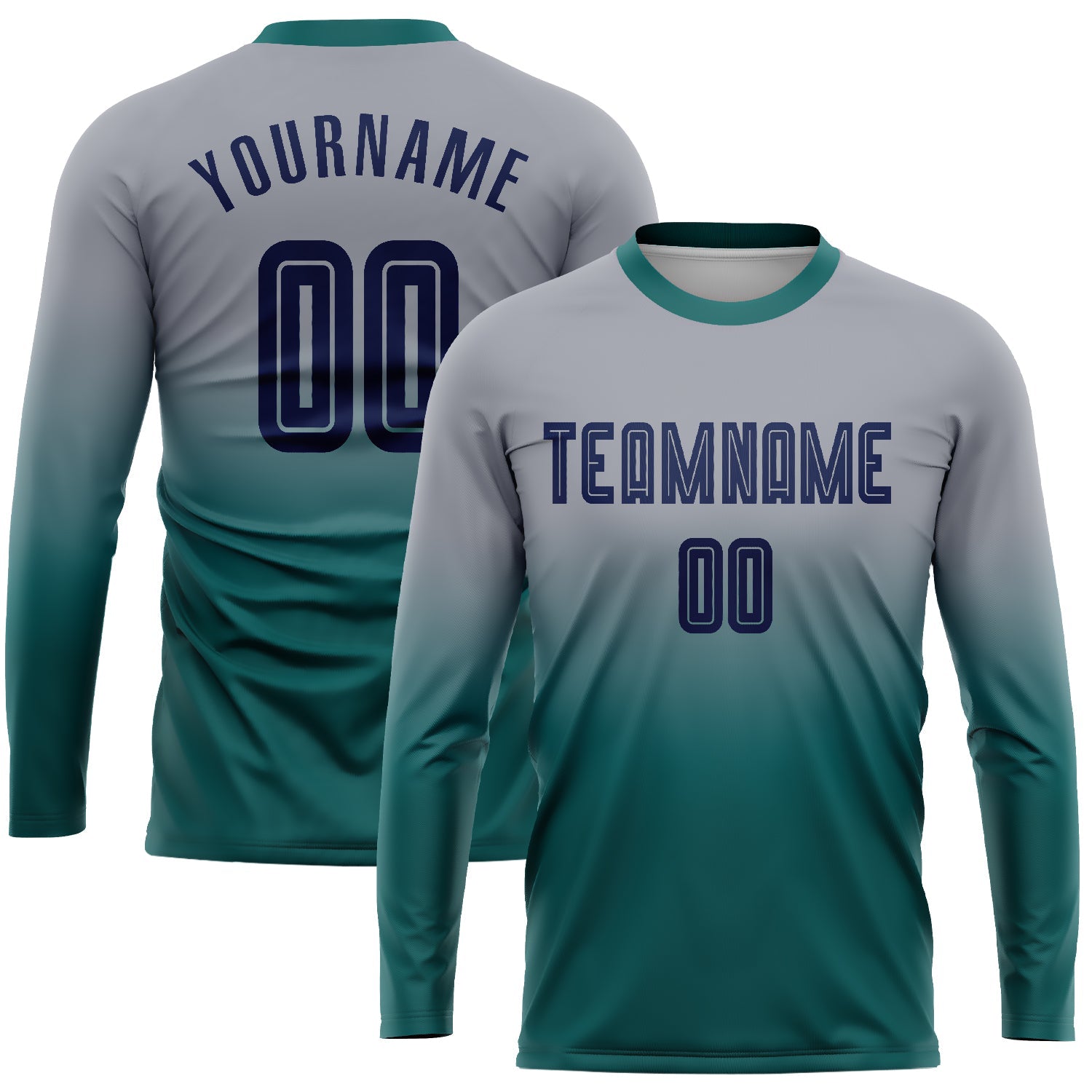 Camiseta de fútbol personalizada de manga larga con desvanecimiento, color gris azulado y azul marino, sublimada